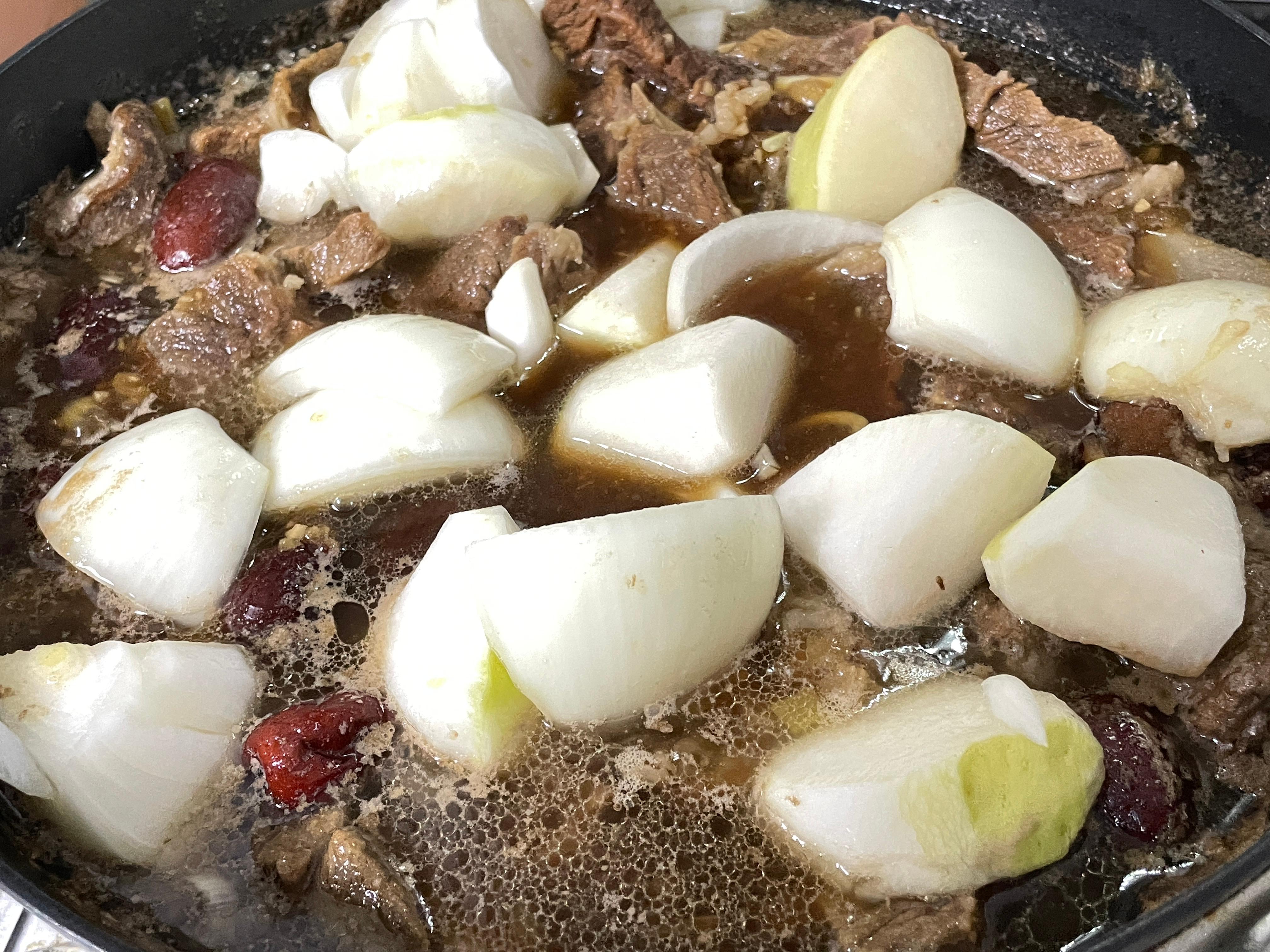 ● 소갈비찜을 40분간 끓인 후 무와 양파를 넣고 20분간 약불에서 끓입니다.