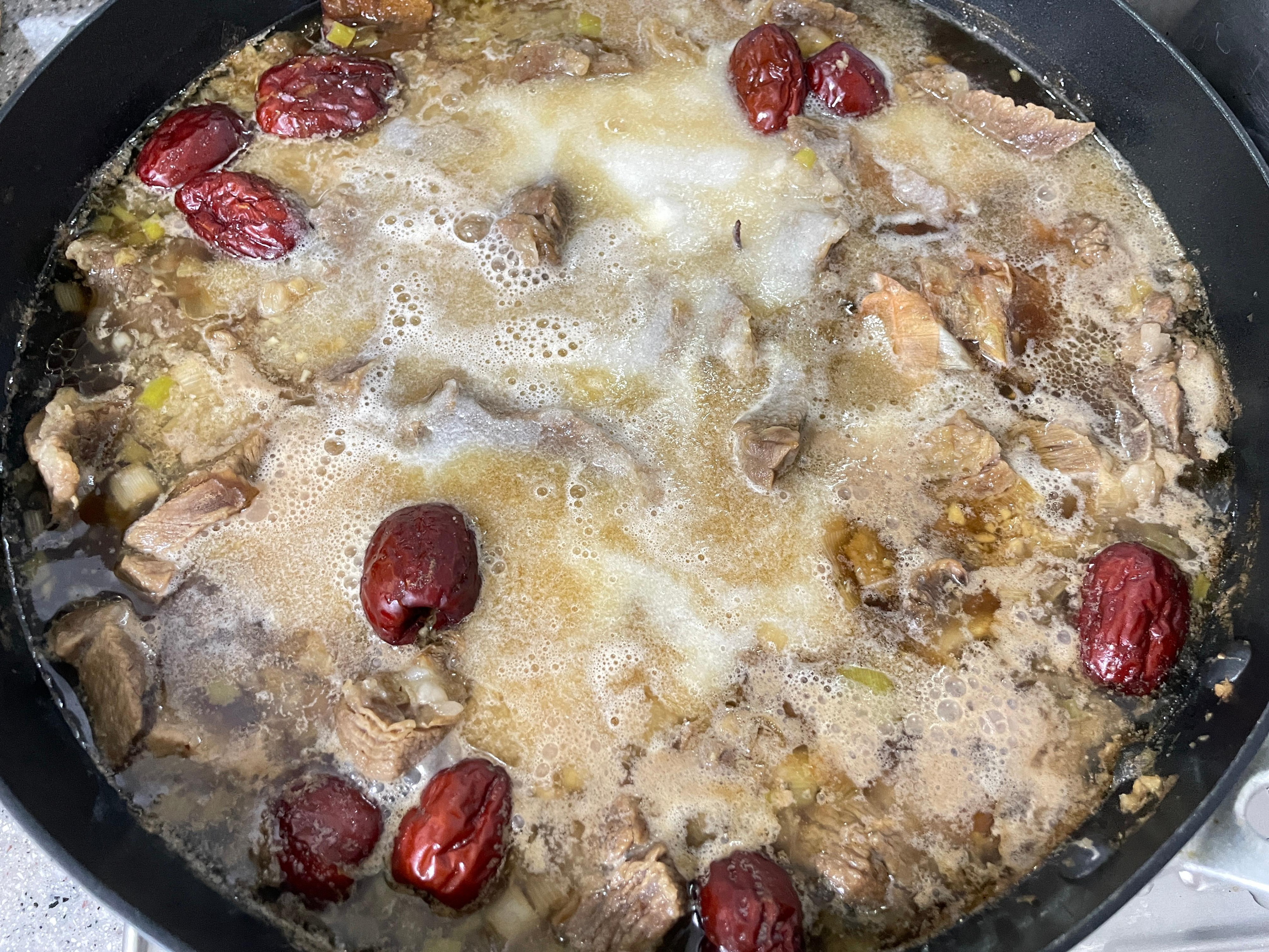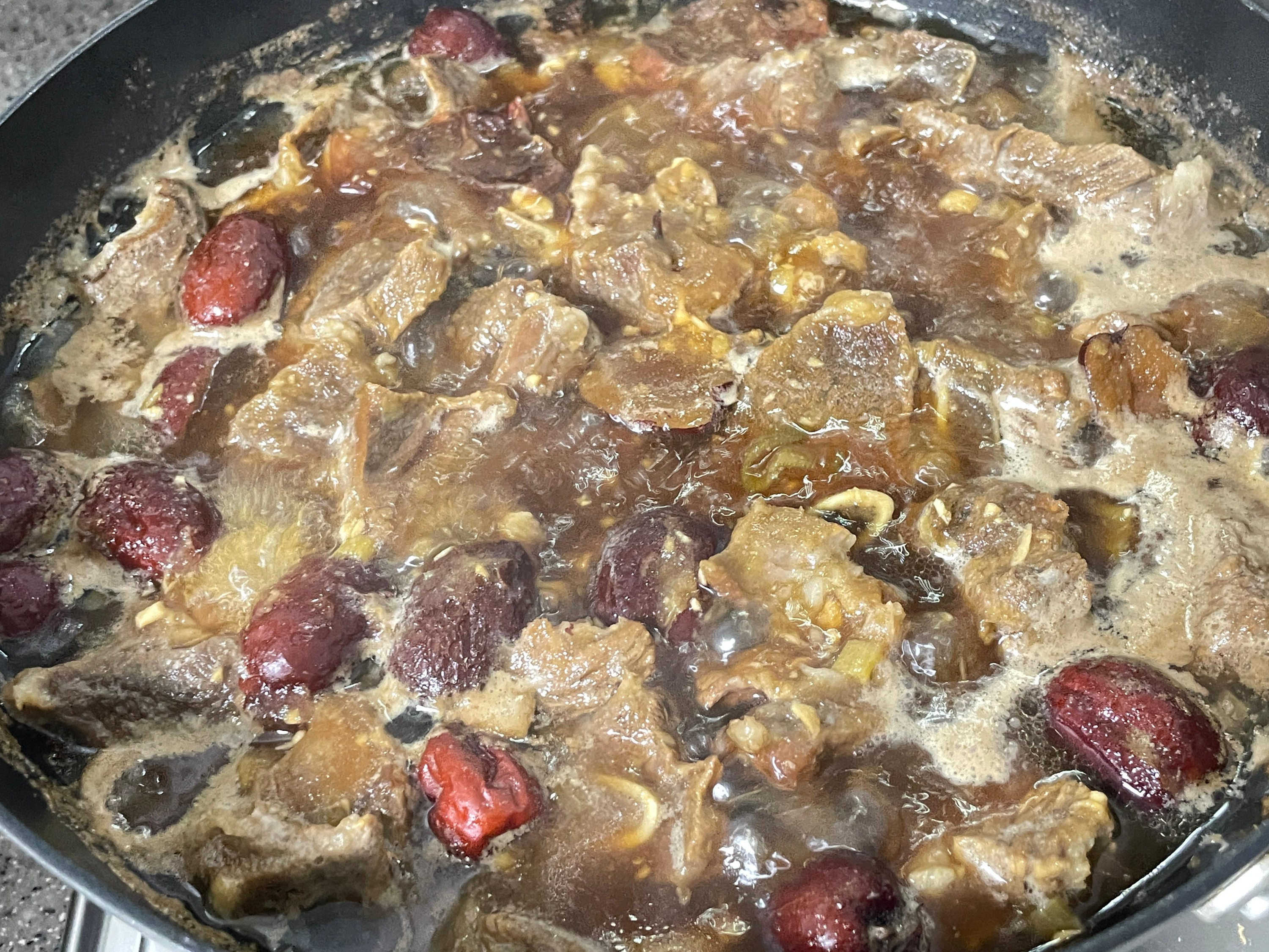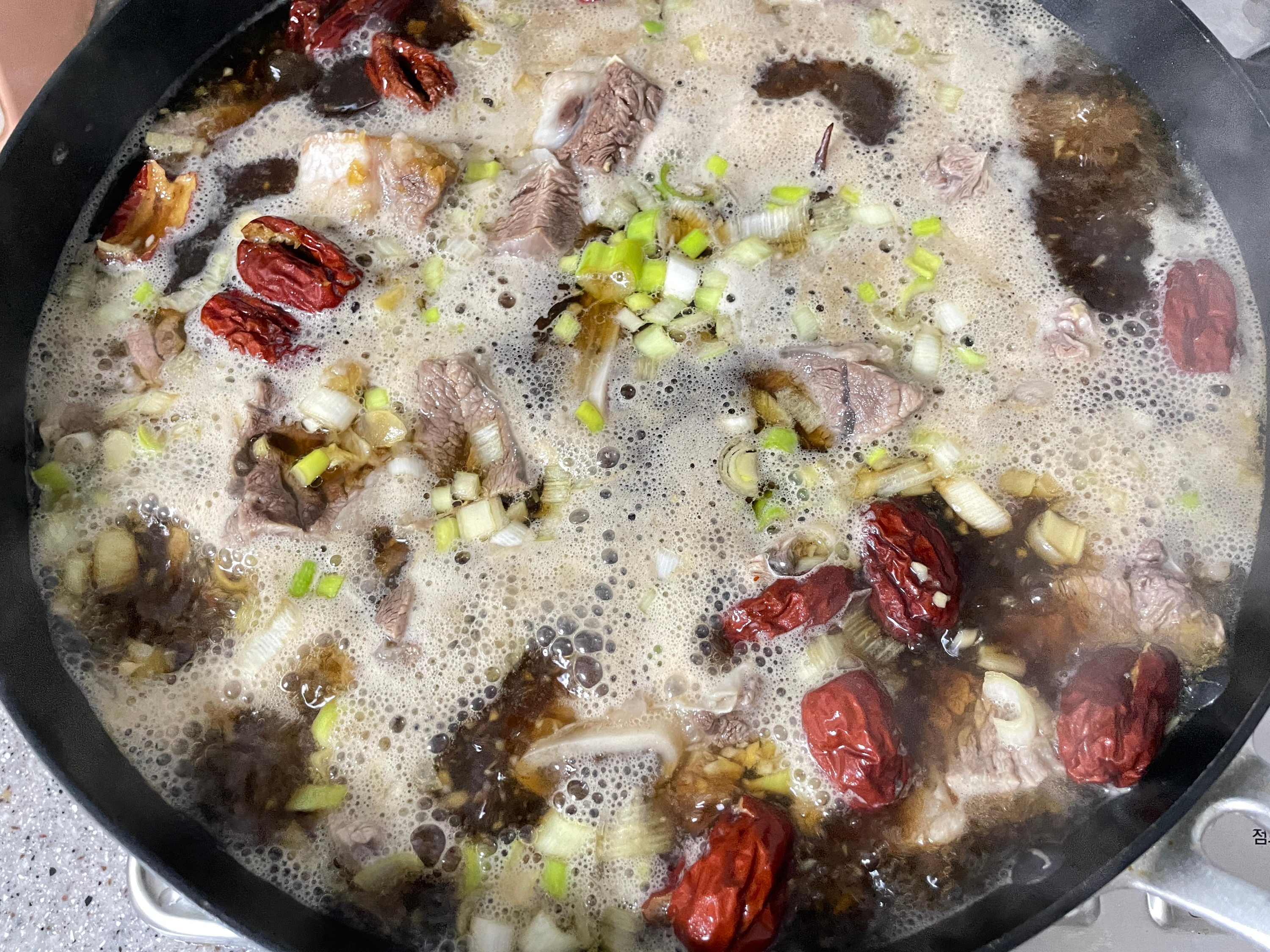 ● 양념을 넣은 갈비에 물 8컵, 대추, 배 간 것을 넣고 뚜껑을 연채로 중불에서 끓으면 약불로 줄여서 40분간 끓여줍니다.