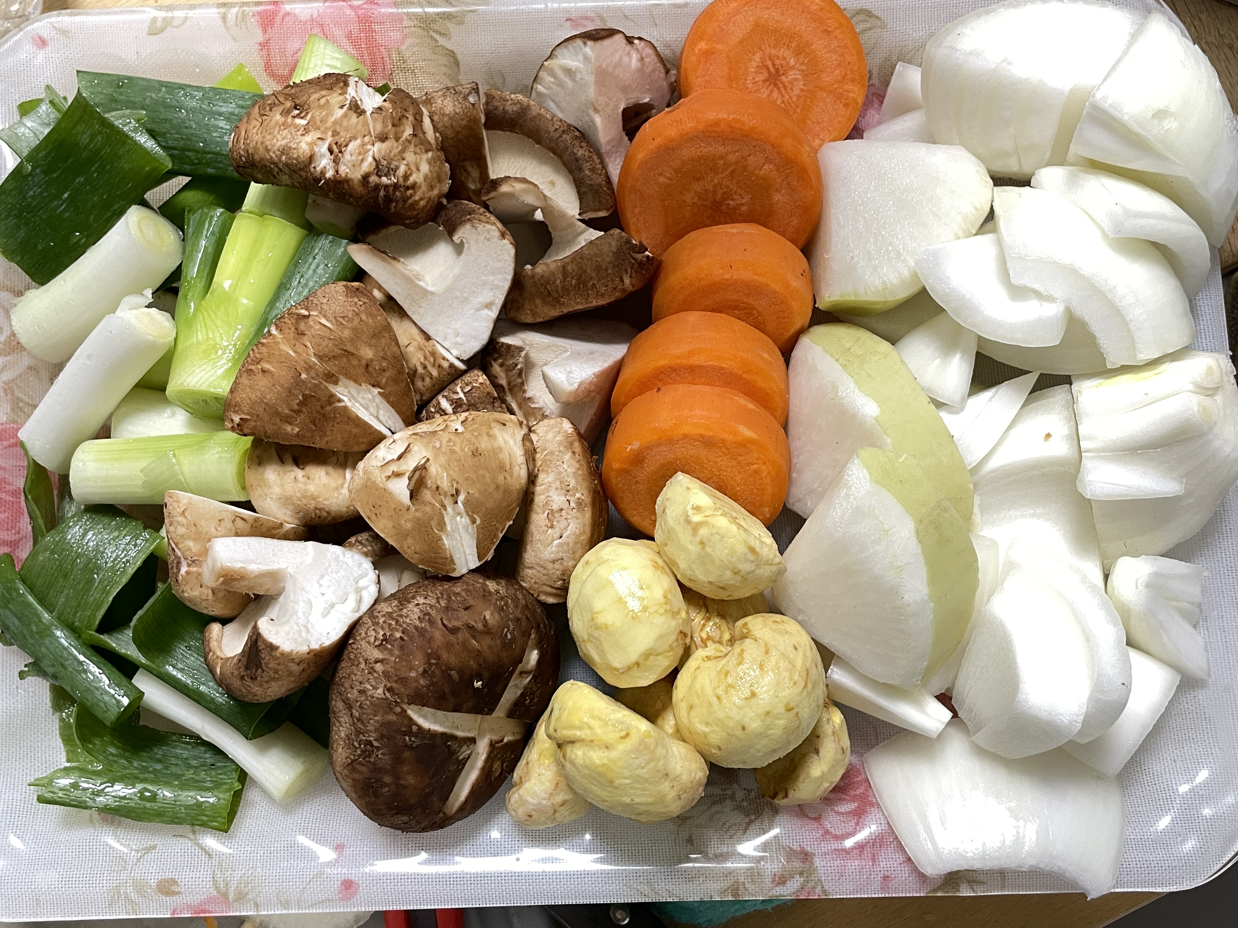 무 200g은 1/4로 자르고 당근 1개는 굵은 쪽은 1/2로 자르고, 양파 큰 것 1개는 1/2로 잘라서 4 등분하고, 표고 7개, 풋고추 5개, 대파 2대, 먹기 좋게 썰어놓습니다.
