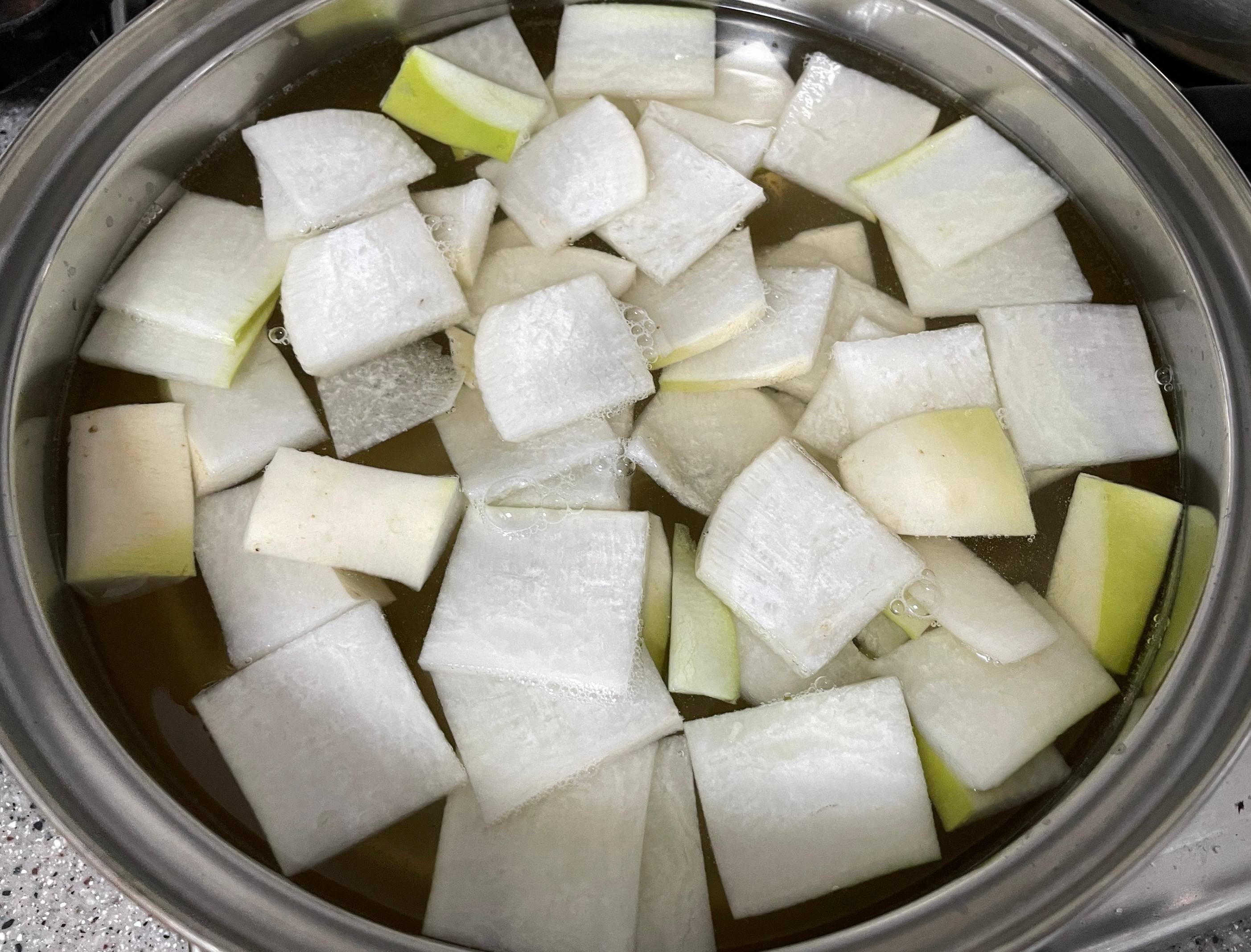 4. 육수에 무를 넣고 강불로 끓이다가 약불로 줄여서 무가 투명해질 때까지 끓여줍니다.
