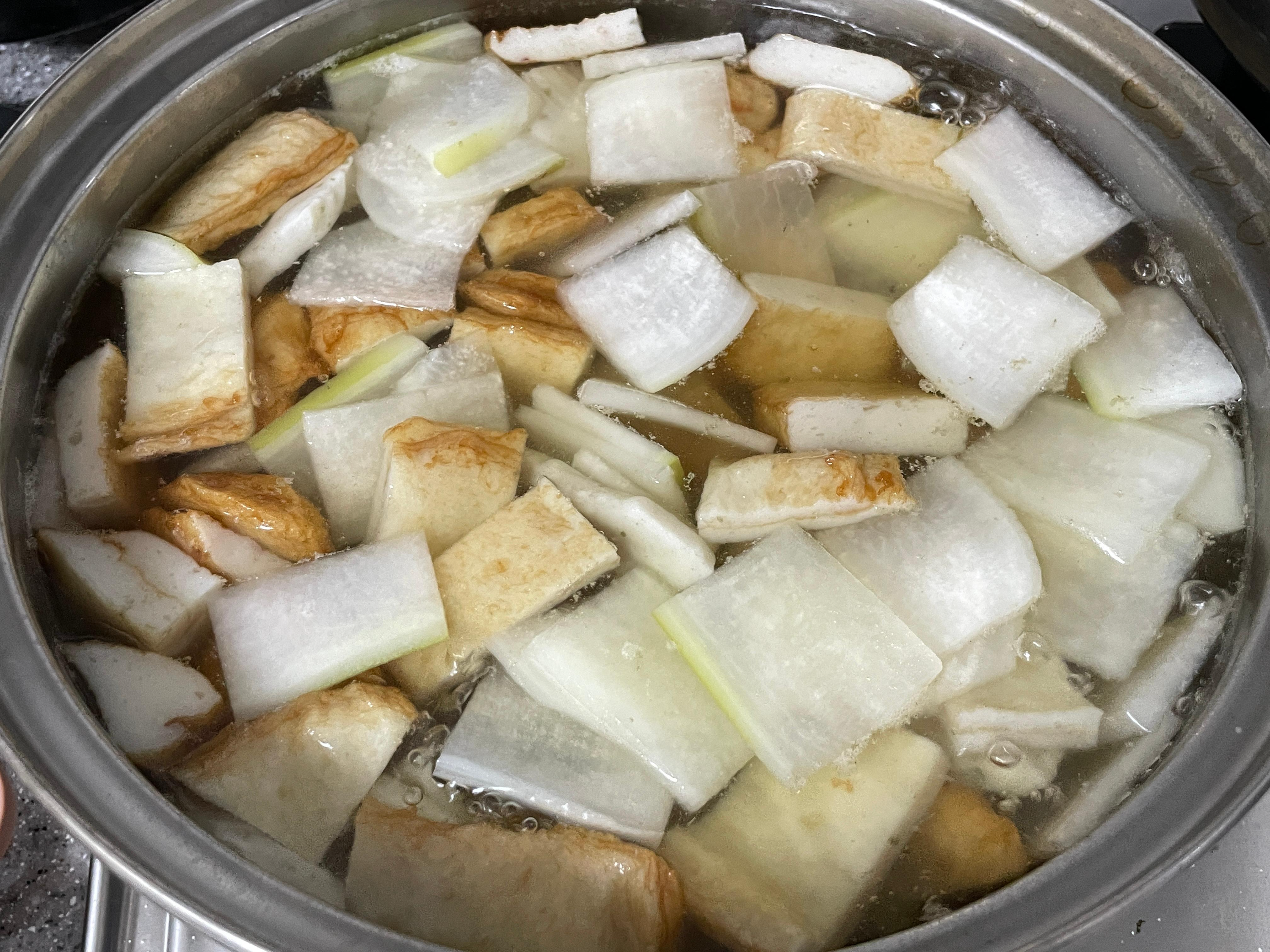 5. 무가 투명해지면 불을 강불로 올리고 어묵을 넣어줍니다.
