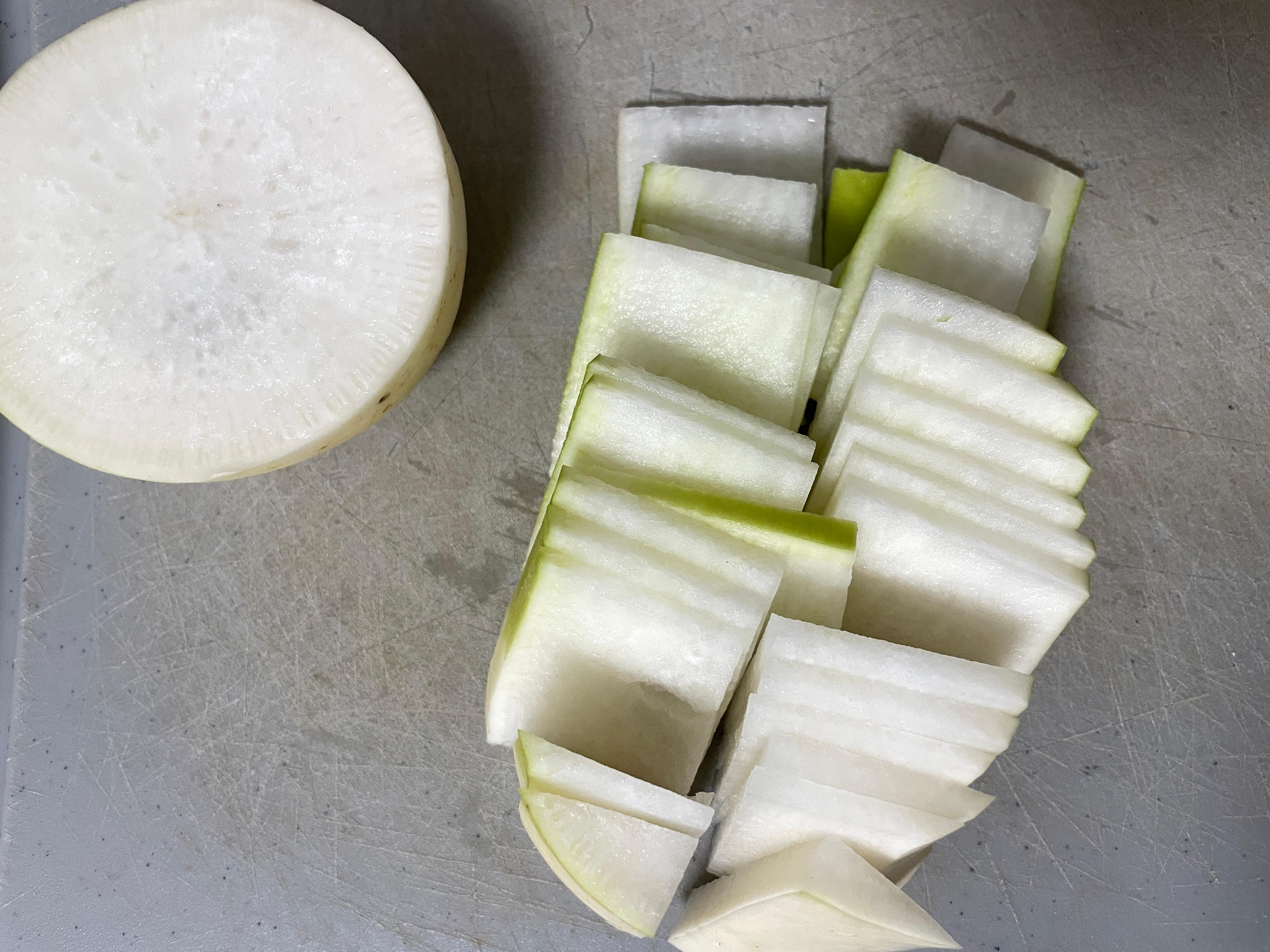 2 시원한 국물을 내는 무는 나박나박 썰어줍니다.