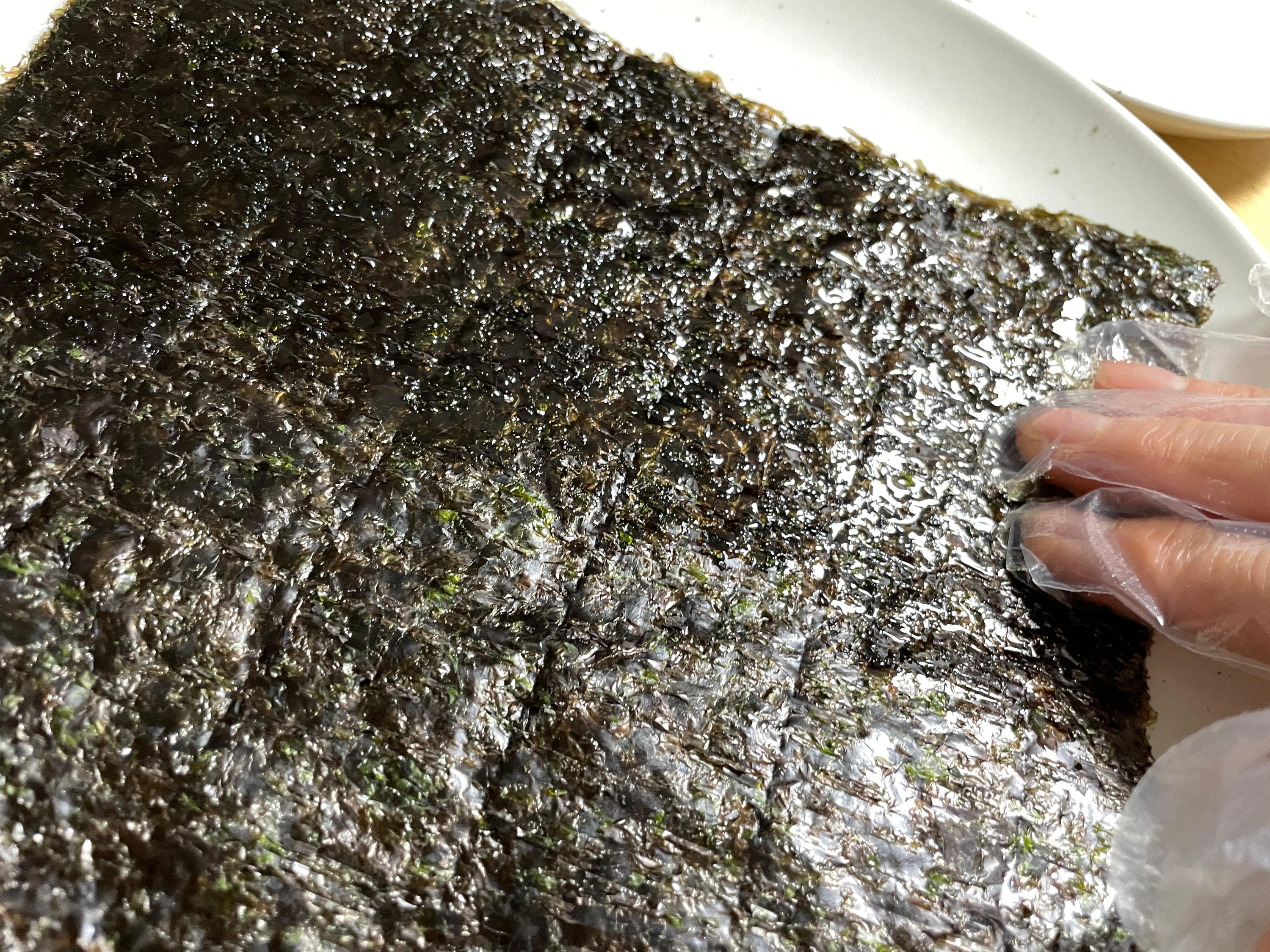 ※ 김을 쨀 때 솔을 이용해서 들기름을 바르면 편하고 좋은데 저는 위생장갑을 끼고 손에 묻혀서 살살 발라줍니다.
