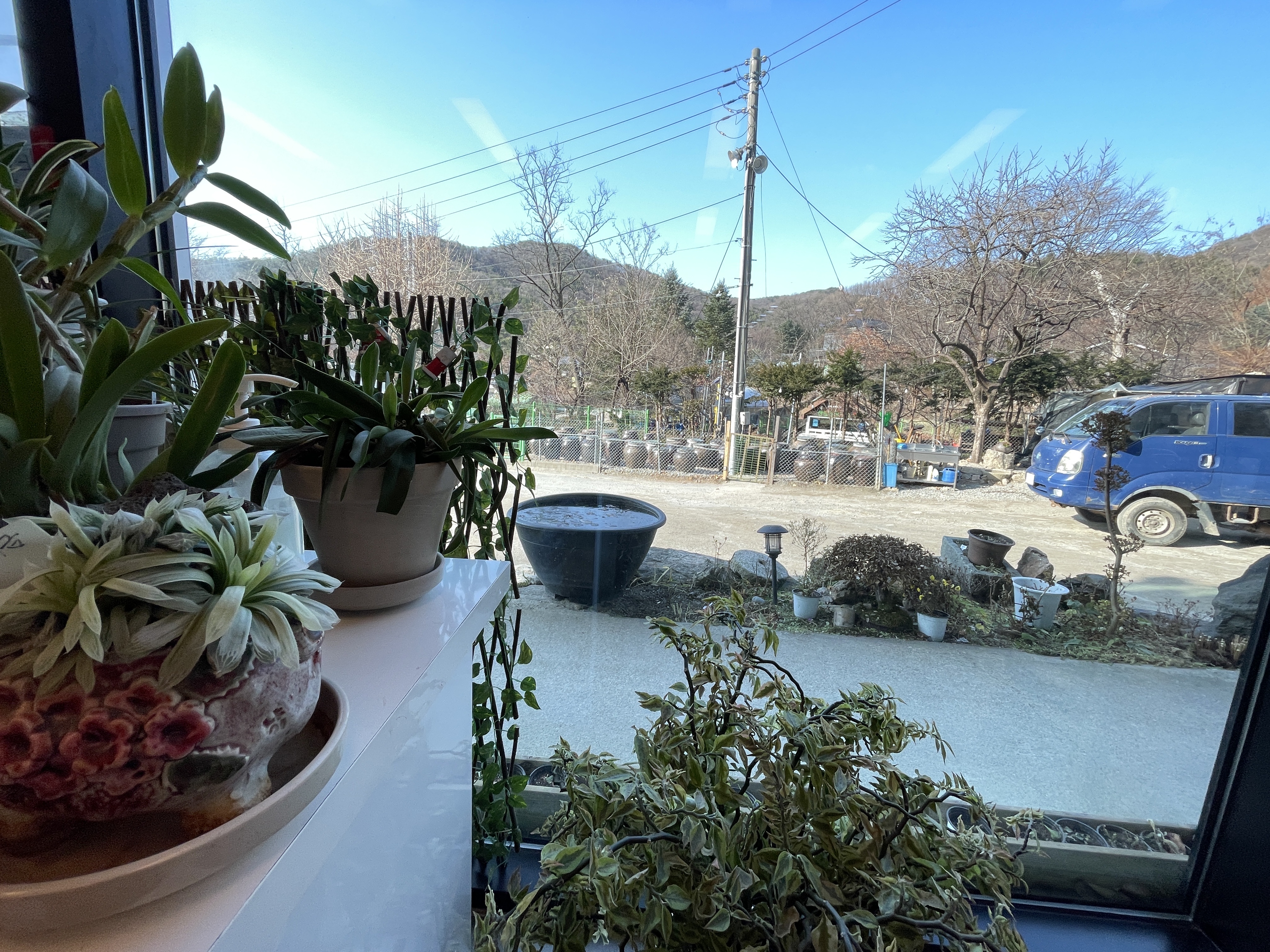 제가 앉은자리옆 창가에서 찍은 사진입니다. 광교산이 병풍처럼 보이고 마당이 상당히 넓어서 주차하기 아주 좋겠어요.