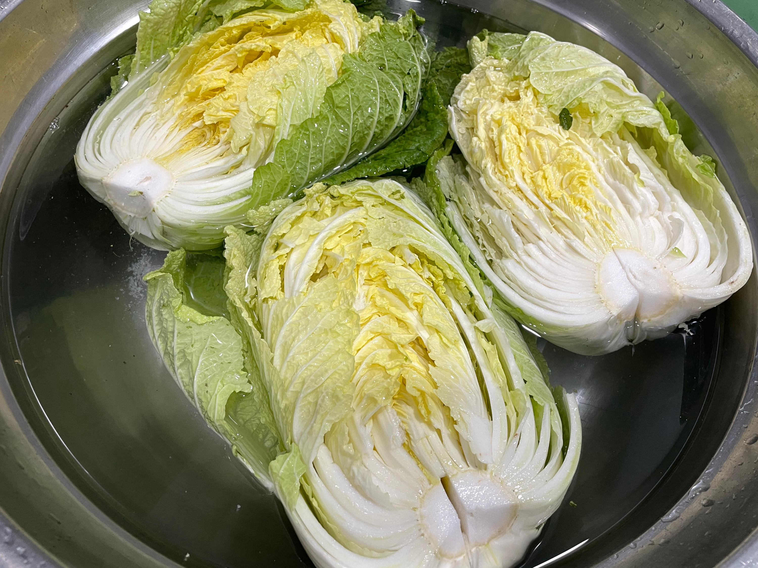 3. 배추를 반으로 가르고 배추를 손질한 후 천일염 풀어놓은 물에 담가줍니다.
