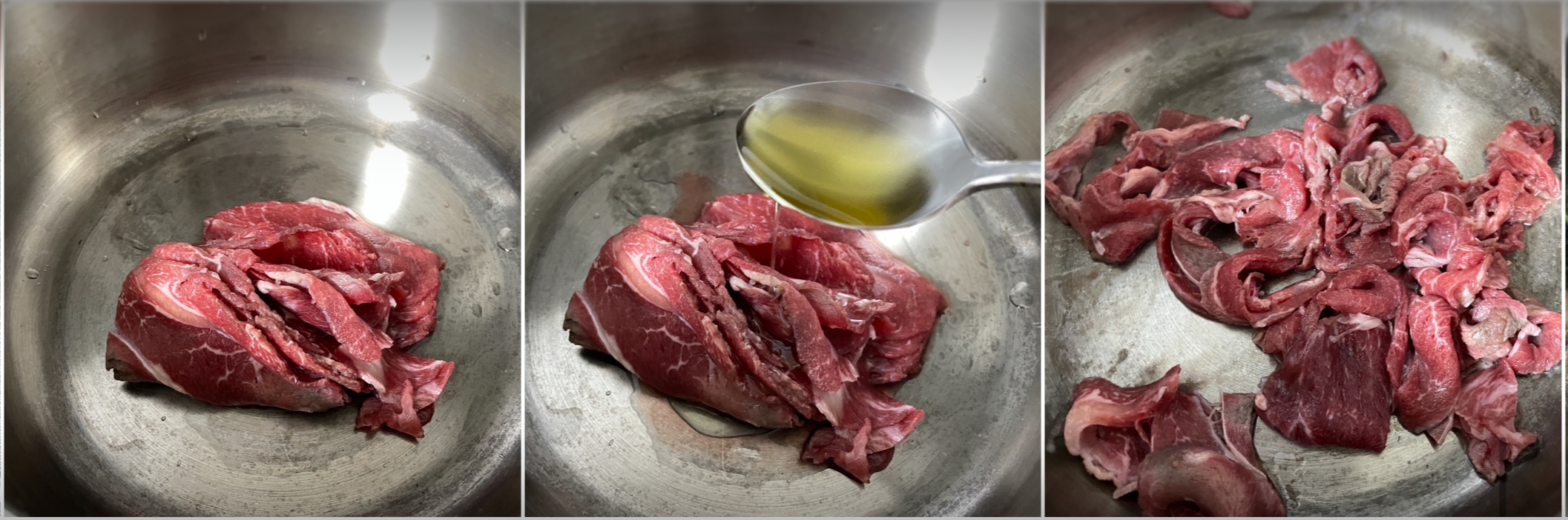 4. 냄비에 소고기와 참기름 1큰술을 넣고 소고기 색이 갈색으로 변할 때까지 볶아줍니다.