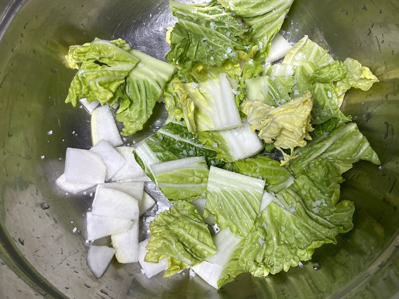 1. 봄동은 잎을 떼어서 깨끗이 씻어 먹기 좋은 크기로 썰고, 무도 껍질을 벗기고 얇게 나박나박 썰어 큰 볼에 봄동과 무를 담고 소금을 약간 뿌려 20~30분 정도 살짝 절입니다.
