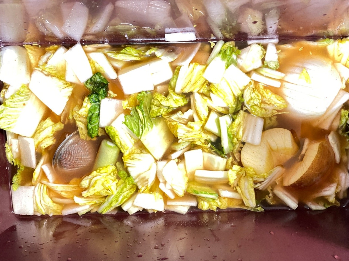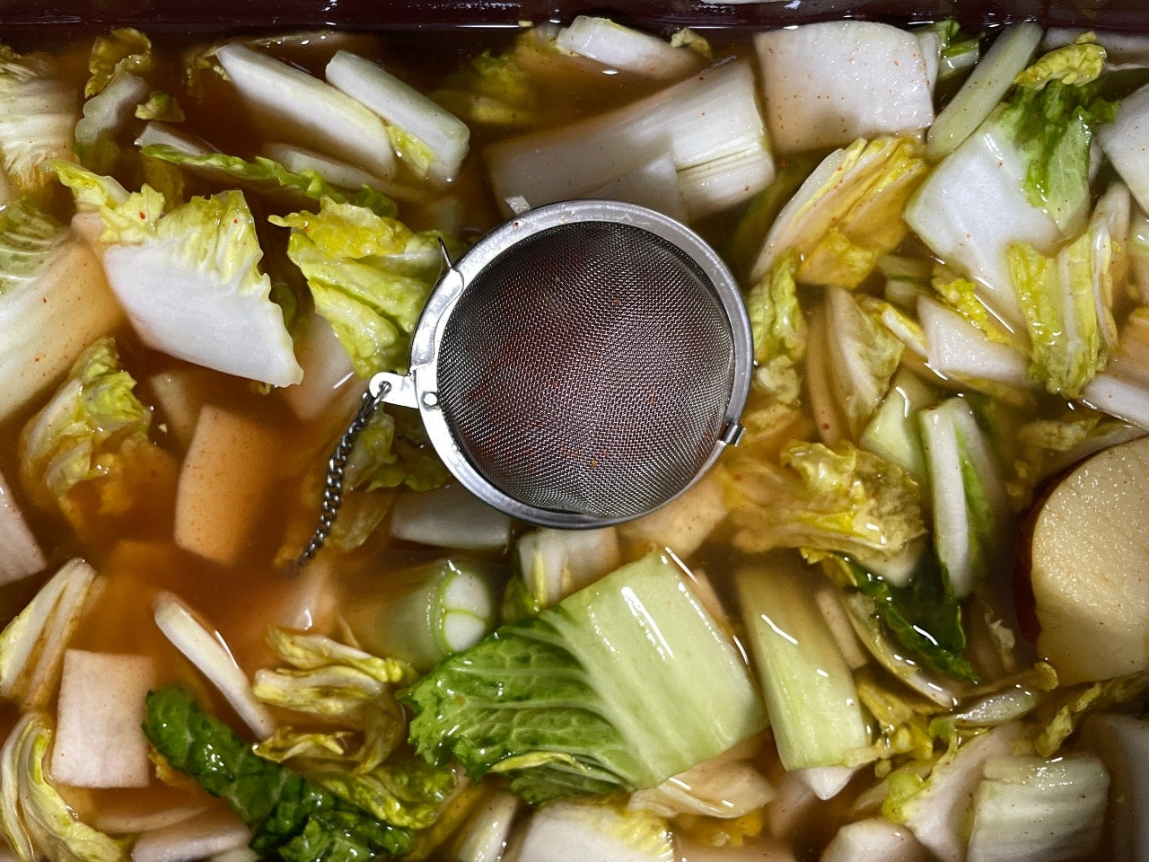 5. 마늘과 생강은 걸음망에 넣어서 봄동물김치국물에 잠기게 넣어주면
