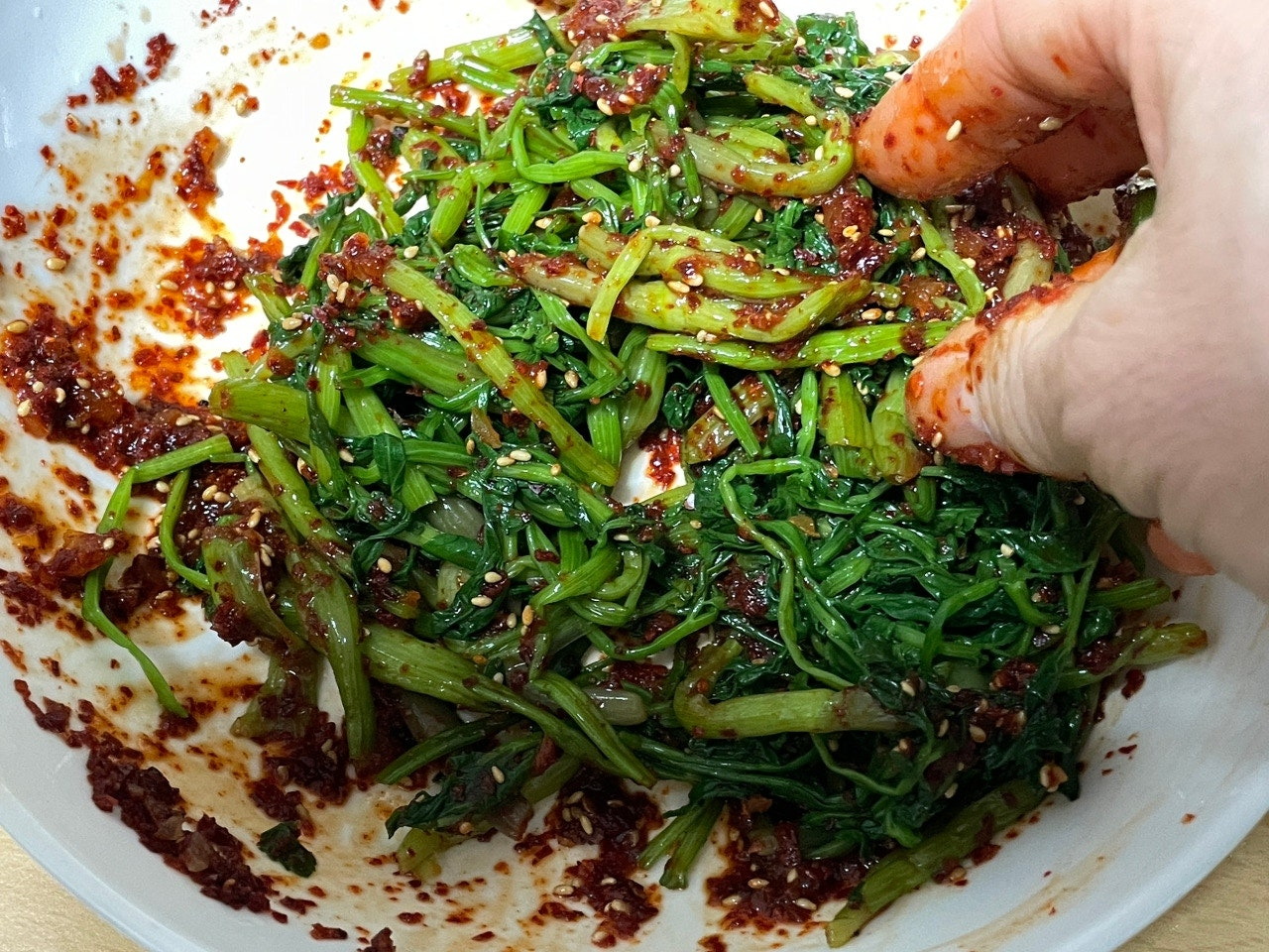손질한 미나리에 양념장을 넣고 조물조물 버무려 줍니다.