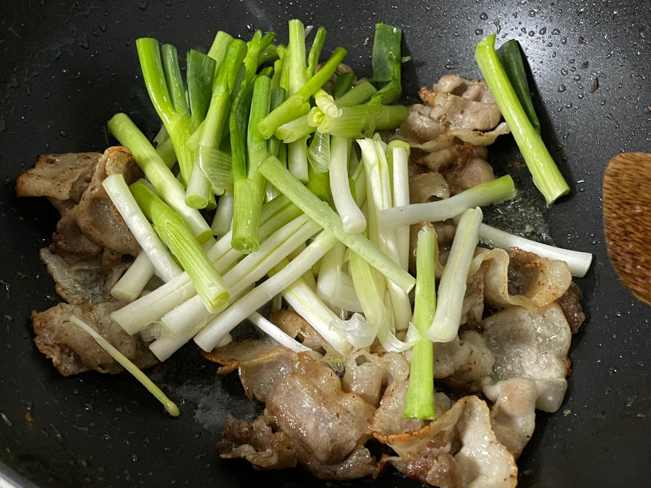 3. 삼겹살에서 기름이 충분히 나오면 손질해 둔 쪽파 흰 부분을