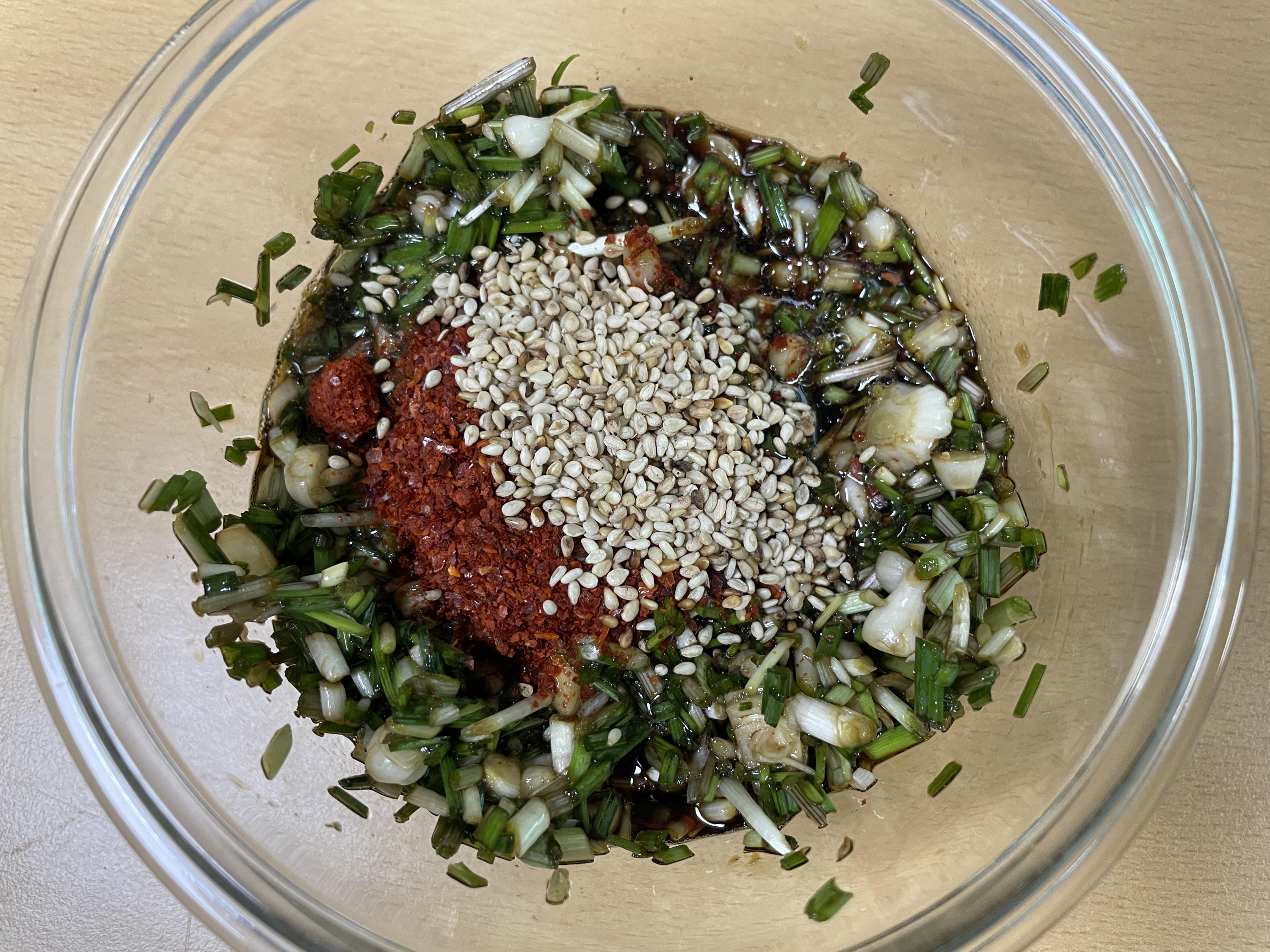 3. 달래와 간장의 농도가 맞으면 고춧가루, 통깨, 고춧가루, 참기름을 넣고 저어주세요.