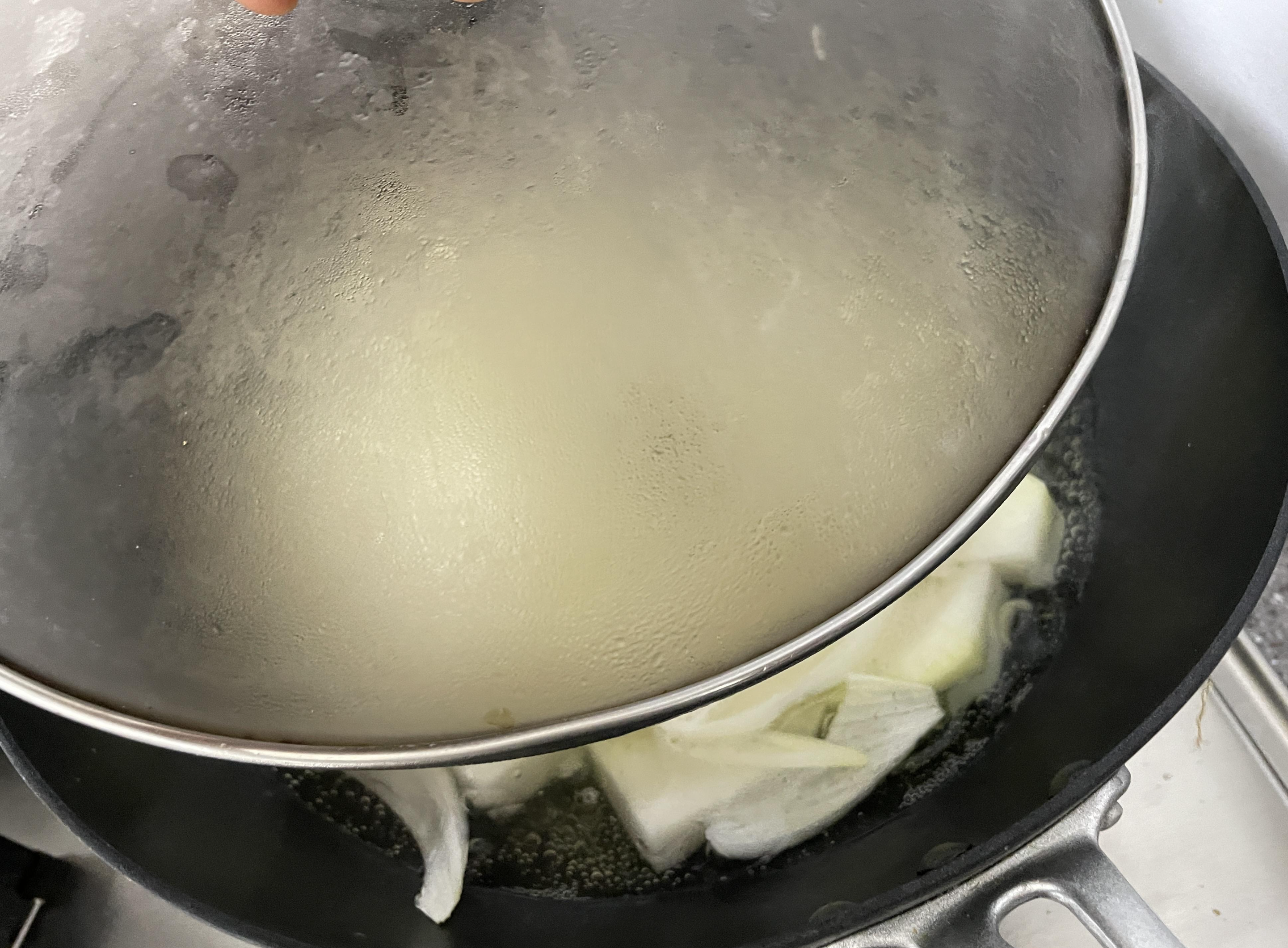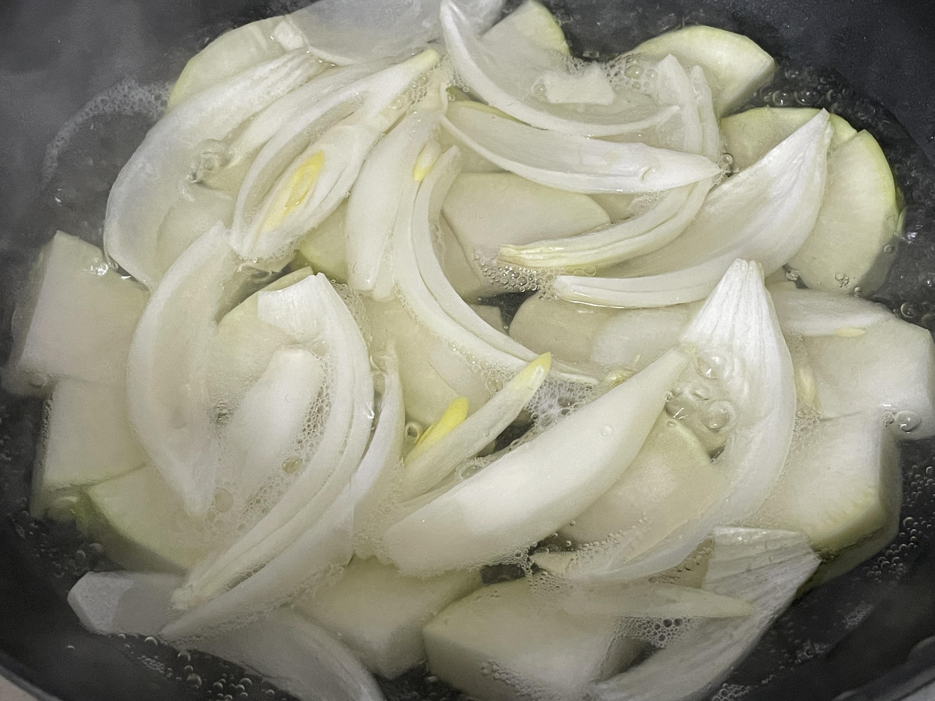 4 무와 양파를 넣은 냄비의 물이 끓기 시작하면