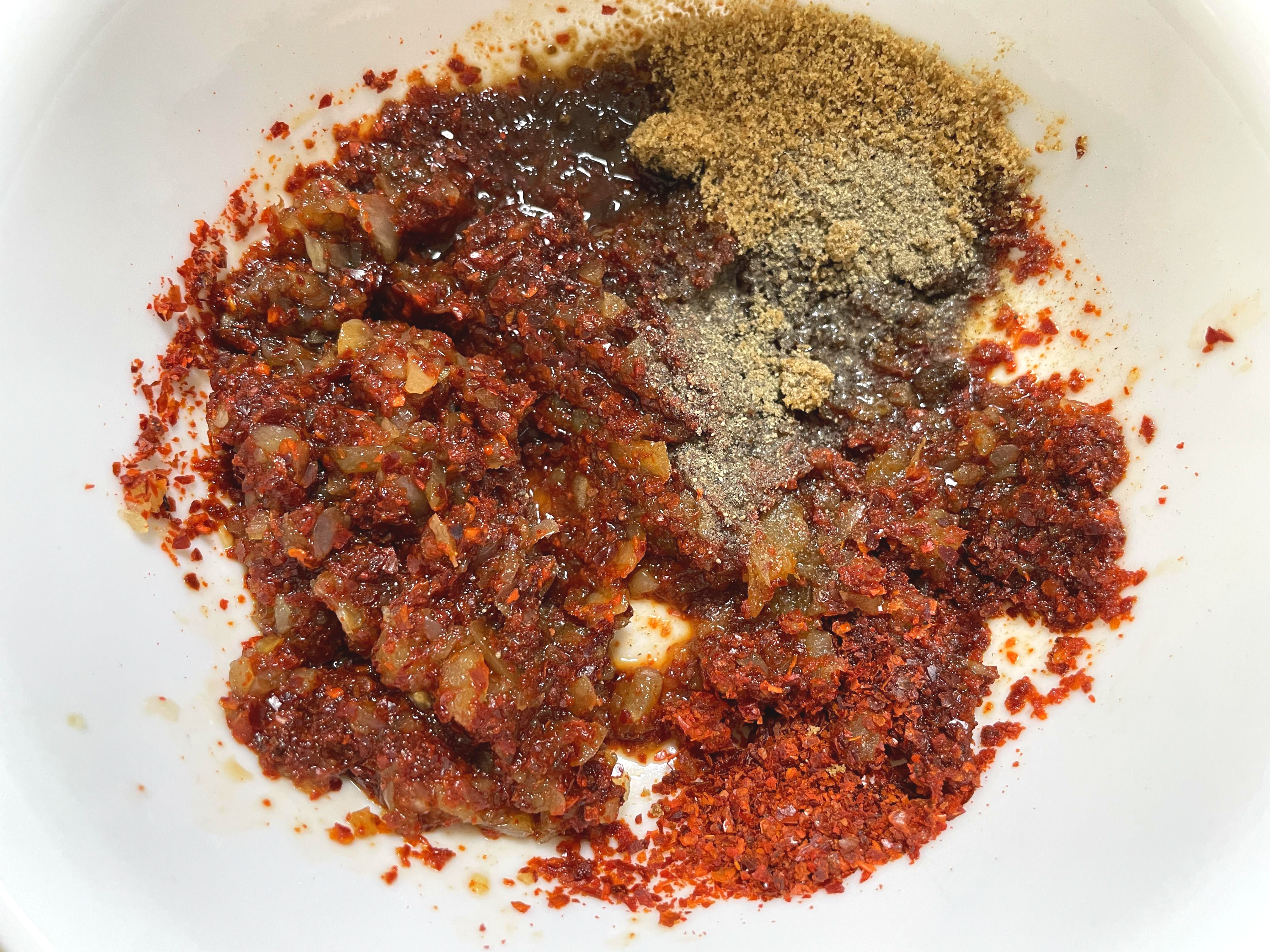 (고춧가루 3스푼, 진간장 2스푼, 국간장 1스푼, 청주 3스푼, 설탕 1스푼, 후추)