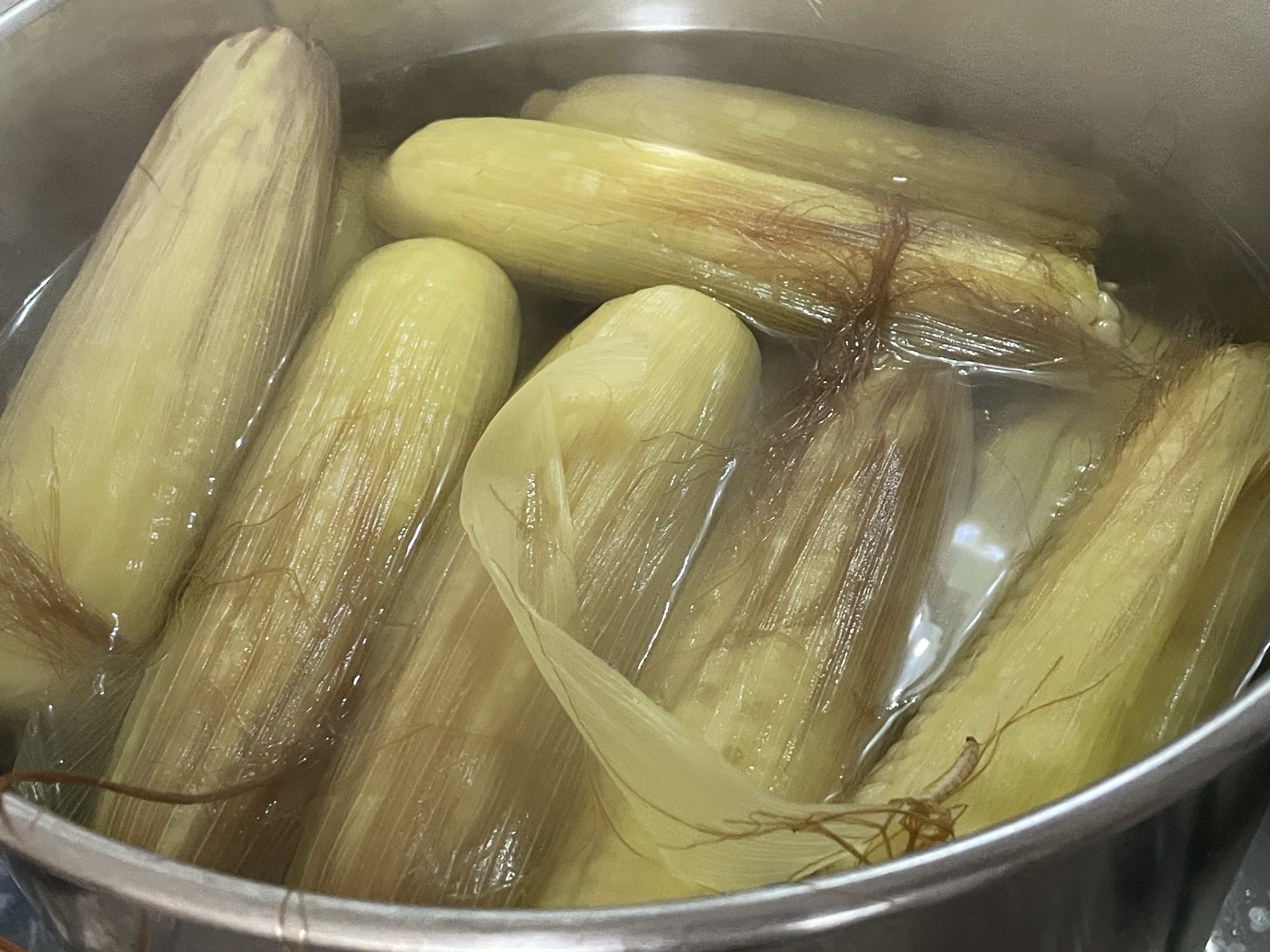 ※. 옥수수 삶은 물을 마시기 위해서는 옥수수 수염과 속껍질을 함께 넣고 삶는 것이 좋아서 옥수수솔과 속껍질 한겹은 남기기 껍질을 벗깁니다.( 옥수수 삶은물은 당뇨환자나, 커피를 마시고 잠이 오지 않을 때 옥수수삶은 물을 마시면 좋아요.)